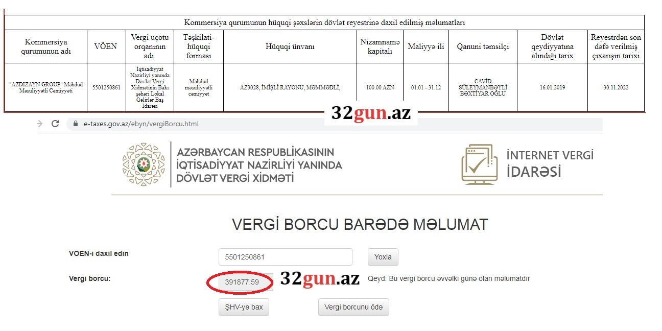 32gun.az-ın əldə etdiyi məlumata görə sözügedən MMC-nin hazırki vergi borcu 391 min 877 manat 59 qəpikdir.