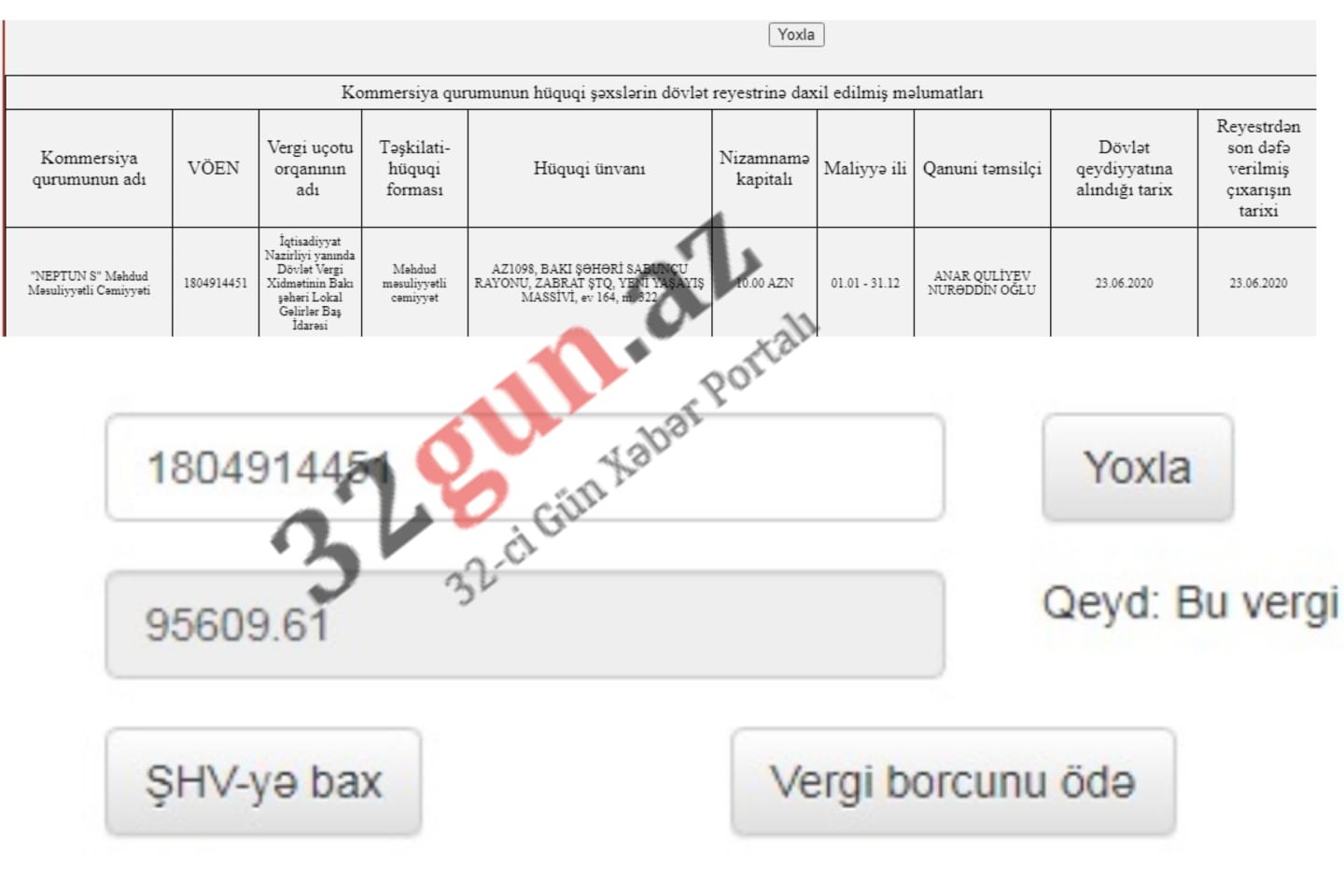 32gun.az xəbər verir ki “Neptu-S” MMC olaraq qeydiyyatdan keçən şirkətin 95 min 609 manat (95609.61AZN) dövlətə vergi bocu var.
