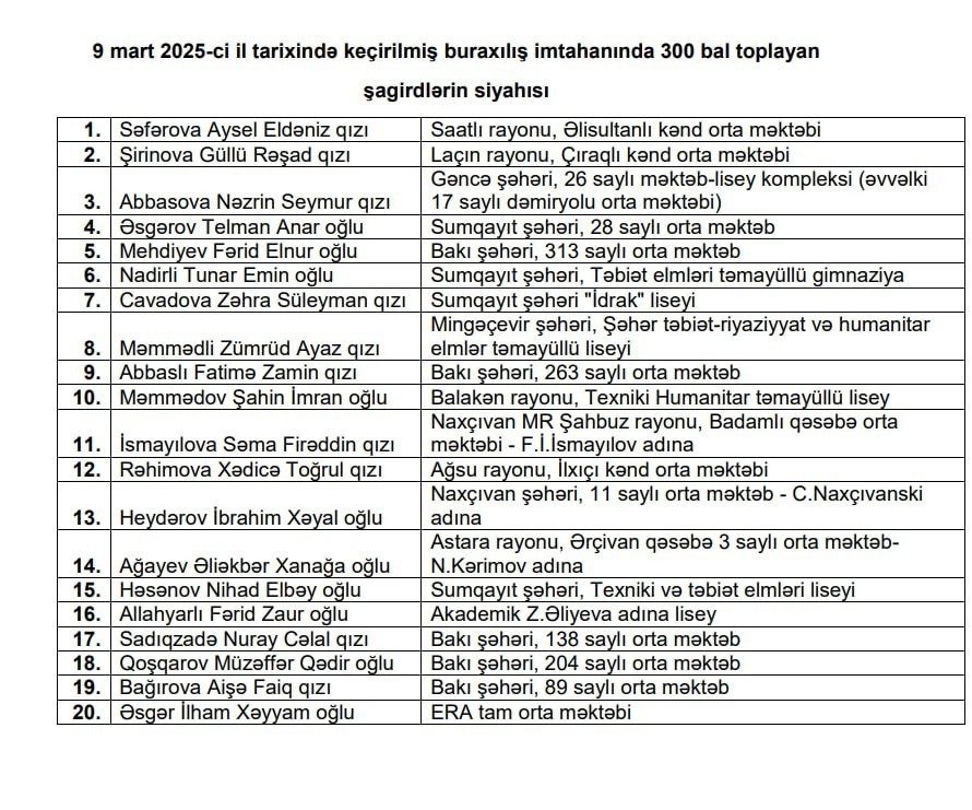 Xəbər verdiyimiz kimi, bu gün tam (11 illik) orta təhsil səviyyəsi üzrə martın 9-da keçirilən buraxılış imtahanının nəticələri elan olunub. İmtahan iştirakçıları arasında 20 nəfər 300 bal toplamaqla ən yüksək nəticəni göstərib. Onlardan 10 nəfəri qız, 10 nəfəri oğlandır.