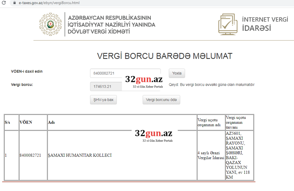 32gun.az-ın əldə etdiyi məlumata görə sözügedən idarənin hazırki vergi borcu 174613.2 AZN-dir.