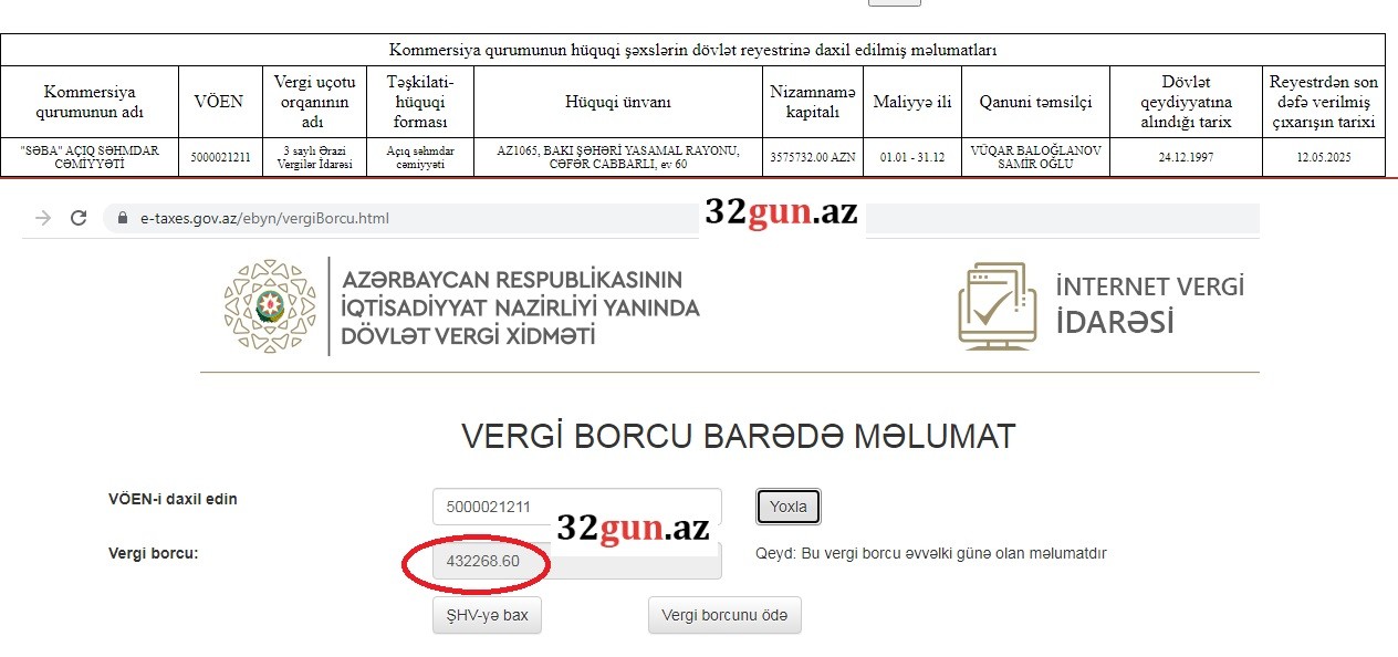 32gun.az DVX-nin açıq mənbəsindən əldə etdiyi vergi borcu ilə bağlı faktı təqdim edir: