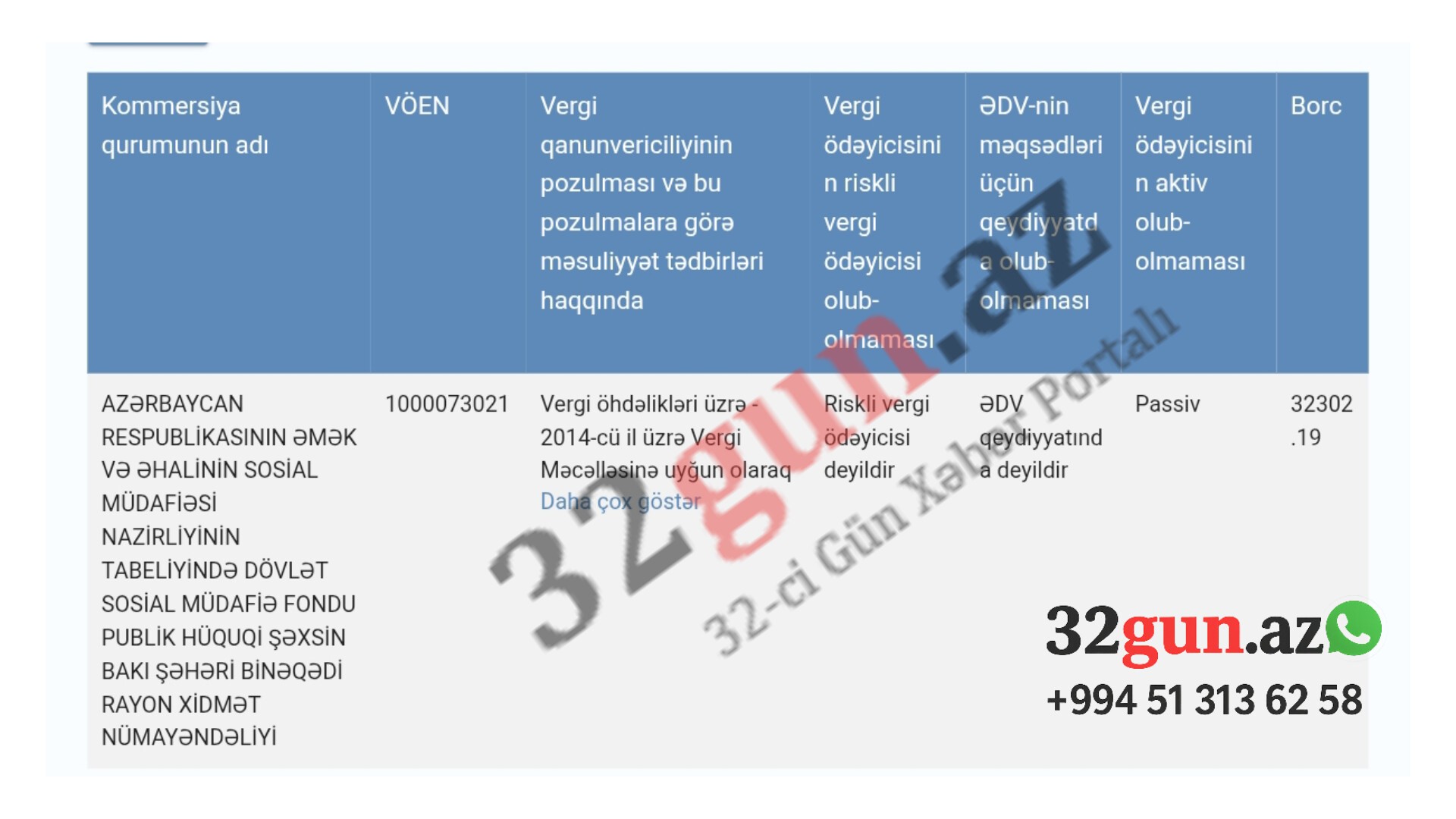 32gun.az-ın əldə etdiyi məlumata görə, nümayəndəliyin dövlət büdcəsinə olan vergi borcu 32 302.19 AZN təşkil edir.